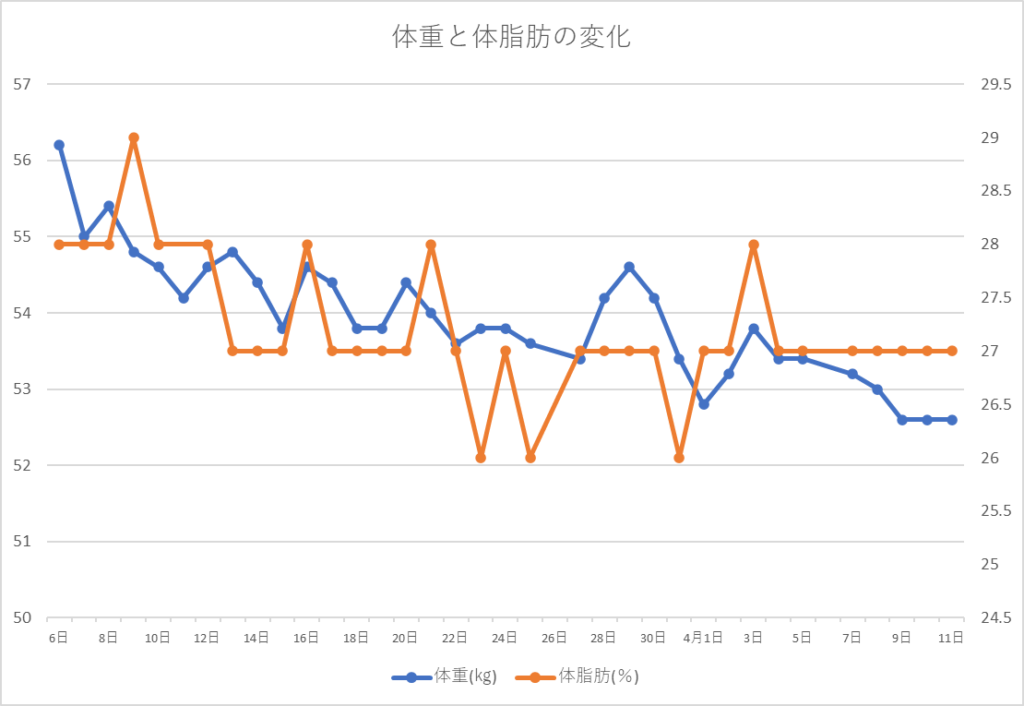 体重と体脂肪の変化をグラフにしてみました。少しずつですが確実に成果は出ています。