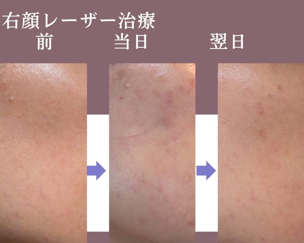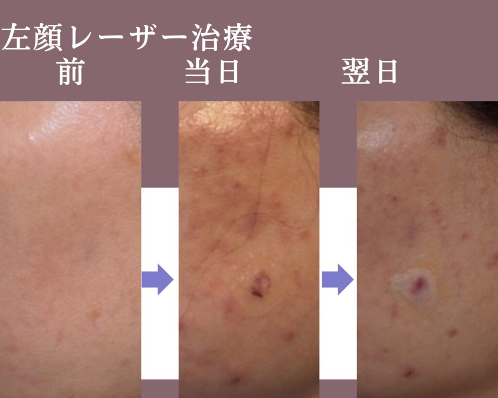 左はシミが多い分、赤みがしっかり出ています。頬下のテープ保護の場所は、盛り上がりがあり前回も全く反応しなかったイボのようなものです。今回は、麻酔して削り取ってもらいました。